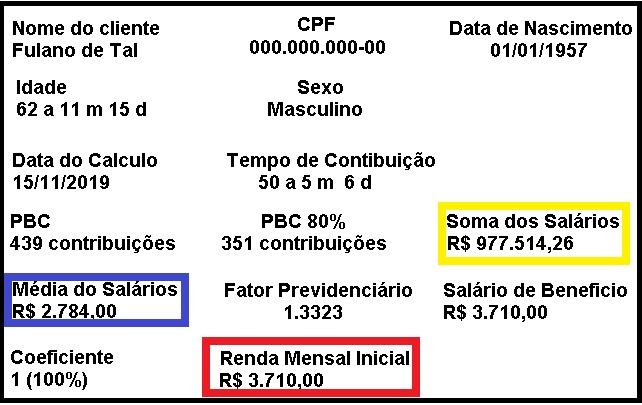 Um exemplo específico: Este Aposentado (abaixo) deste 2019 se aposentou com R$ 2.744,94, baseada pela a lei 9.876/1999 e EC 103/2019, com a base no calulo, Art 33 / Decreto 3.048/1999, veja pelo esquema os valores que teria que receber: